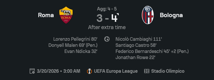 เกมยูโรปา ลีก คู่นี้มันส์แบบกองหลังมีหลอนแน่ ๆ สุดท้าย ผลบอลสด จบที่ โรม่า แพ้ โบโลญญ่า 3-4 หลังต่อเวลาพิเศษ ทั้งที่เจ้าถิ่นไล่กลับมาจากตามหลังจนตีเสมอ 3-3 ได้แล้ว แต่ดันโดน นิโคโล คัมเบียกี ซัดนาที 111 ปิดกล่องแบบแฟนหมาป่ามีจุก
