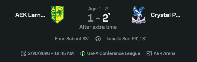 ศึก ยูโรปา คอนเฟอเรนซ์ ลีก 2025/26 คู่นี้สกอร์ดูเหมือนพาเลซชนะตามงาน แต่ในสนามบอกเลยว่าไม่ได้ง่าย เพราะเออีเค ลาร์นาก้าสู้สุดทาง ก่อนจะโดน อิสไมลา ซาร์ร์ ซัดปิดบัญชี พา คริสตัล พาเลซ บุกชนะ 2-1 หลังต่อเวลาพิเศษ ทำให้ ผลบอลสด คู่นี้จบแบบทีมที่คมกว่าผ่านเข้ารอบไป