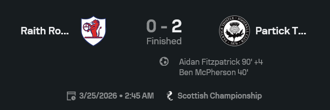 ไฮไลท์บอลสก็อตแลนด์ แชมเปี้ยนชิพ 2025/26 แพททริค ธิสเซิล เชือดเรธ โรเวอร์ส 0-2 ฟิตซ์แพทริคปิดกล่อง เจ้าถิ่นบุกแทบตายแต่จบไม่ลง