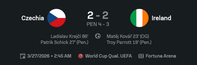 - นาที 23 Matej Kovář ทำเข้าประตูตัวเอง ไอร์แลนด์หนี 0-2