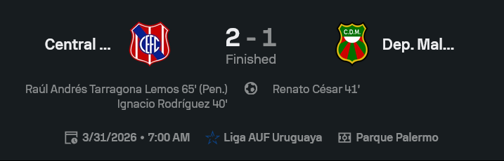 ศึกอุรุกวัย พรีเมียร์ดิวิชั่นคู่นี้ ผลบอลสด ออกมาสุดเดือด เซ็นทรัล เอสปันญ่อล เปิดบ้านเฉือน เดปอร์ติโบ้ มัลโดนาโด้ 2-1 แบบมีลุ้นจนวินาทีท้าย นำก่อน โดนตีเสมอทันควัน ก่อนมาได้จุดโทษตัดสินเกม และรอดตัวจากจุดโทษช่วงทดเจ็บของทีมเยือนที่ยิงพลาดเองแบบน่าเจ็บใจ