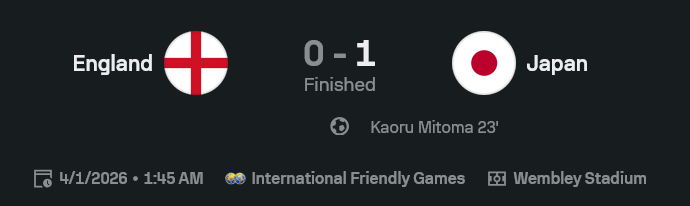 ศึกกระชับมิตรทีมชาติเกมนี้ ผลบอลสด ออกมาบาดใจแฟนสิงโตคำรามไม่น้อย เพราะอังกฤษครองเกมเหนือกว่าชัด แต่สุดท้ายโดนญี่ปุ่นสวนทีเดียวเจ็บ จากประตูชัยของ คาโอรุ มิโตมะ นาที 23 ส่งให้ทีมเยือนบุกชนะ 0-1 แบบนิ่งและคมกว่า