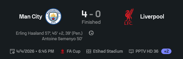 ศึก เอฟเอ คัพ อังกฤษ คู่นี้จบแบบเจ็บจริงสำหรับลิเวอร์พูล เมื่อ แมนเชสเตอร์ ซิตี้ เปิดบ้านถล่ม 4-0 แบบไม่ต้องเถียงเรื่องความเด็ดขาด เกมโดยรวมสูสีพอสมควร แต่พอถึงจังหวะตัดสิน ซิตี้คมกว่าเยอะ ทำให้ ผลบอลสด คู่นี้ออกมาขาดกว่ารูปเกม