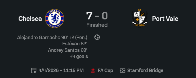 ศึก เอฟเอ คัพ อังกฤษ เกมนี้ ผลบอลสด ออกมาชัดแบบไม่ต้องตีความ เชลซีเปิดบ้านถล่มพอร์ท เวล 7-0 ตั้งแต่นำเร็วในนาที 2 เกมก็ไหลไปทางเดียว ทีมเยือนพยายามสู้ แต่โดนขึงจนแทบเงยไม่ขึ้น