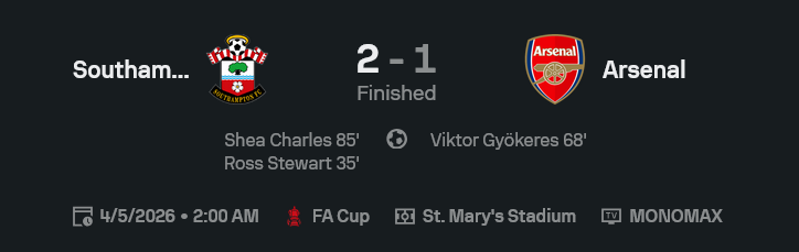 ศึก เอฟเอ คัพ อังกฤษ จบแบบปืนฝืดไม่เลิก เมื่อ เซาธ์แฮมป์ตัน เปิดบ้านเชือด อาร์เซนอล 2-1 ทั้งที่ทีมเยือนครองบอลมากกว่า ยิงมากกว่า แต่ ผลบอลสด ไม่ได้ตัดสินกันที่ใครบุกเยอะ มันวัดกันที่ใครคมกว่า และเกมนี้เจ้าถิ่นทำได้เด็ดขาดกว่า
