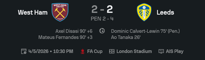 ศึก เอฟเอ คัพ อังกฤษ คู่นี้เดือดตั้งแต่ต้นจนจบ ลีดส์ออกนำก่อน 2-0 จาก อาโอ ทานากะ และจุดโทษของ โดมินิก คัลเวิร์ต-ลูวิน ก่อนเวสต์แฮมฮึดนรกช่วงทดเจ็บ ยิงสองเม็ดรวดจาก มาเตอุส แฟร์นานเดส และ อักเซล ดิซาซี่ ทำให้ ผลบอลสด จบ 120 นาทีที่ 2-2 แต่พอถึงเวลาตัดสินจริง ลีดส์นิ่งกว่าและชนะจุดโทษ 4-2 ผ่านเข้ารอบแบบใจแข็งกว่าเห็น ๆ