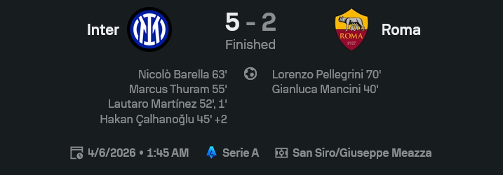 ศึก กัลโช่ เซเรีย อา เกมนี้เดือดตั้งแต่นาทีแรก เพราะ ผลบอลสด ออกมาชนิดแฟนโรม่าได้แต่มองตาปริบ ๆ อินเตอร์เปิดหัวไว กดโรม่าอยู่หมัด ก่อนปิดจ็อบด้วยชัยชนะ 5-2 แบบไม่ต้องลุ้นมากช่วงท้าย เกมนี้เจ้าถิ่นเหนือกว่าทั้งจังหวะบุก ความคม และความต่อเนื่องของเกม