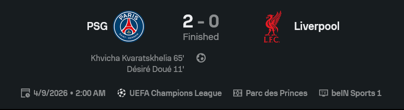 ศึกยูฟ่า แชมเปี้ยนส์ ลีก คู่นี้จบแบบ ผลบอลสด ที่แฟนหงส์ดูแล้วมีสะดุ้ง เพราะเปแอสเชเล่นเหนือกว่าชัดเจนตั้งแต่ต้นเกม ได้ประตูนำเร็วจาก เดซีเร่ ดูเอ้ นาที 11 ก่อน ควิชา ควารัตสเคเลีย ซัดปิดกล่องนาที 65 พาเจ้าถิ่นชนะลิเวอร์พูล 2-0 แบบคุมเกมแทบทั้งหมด ขณะที่ทีมเยือนเล่นไม่ออก เจอเพรสหนัก เจอต่อบอลเร็ว แล้วก็ไล่ตามเงากันทั้งคืน