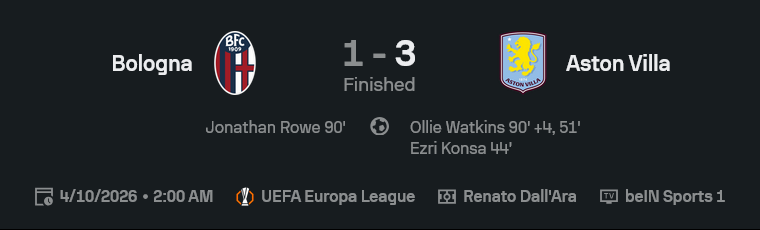 เกม ยูฟ่า ยูโรปา ลีก คู่นี้จบแบบเจ็บจี๊ดสำหรับเจ้าถิ่น เพราะโบโลญญ่าไม่ได้เล่นแย่เลย ครองบอลมากกว่า บุกมากกว่า แต่พอถึงจังหวะสุดท้ายกลับไม่คมพอ สุดท้าย ผลบอลสด ฟ้องชัดว่าแอสตัน วิลล่าเฉียบกว่า บุกมาชนะ 3-1 และกุมความได้เปรียบไปเต็มๆ