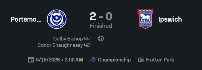 - โอกาสจะแจ้ง: พอร์ทสมัธ 3 อิปสวิช 1