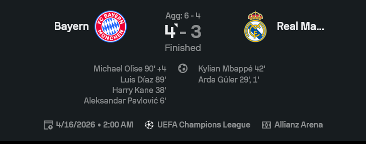 ศึก ยูฟ่า แชมเปี้ยนส์ ลีก คู่นี้เล่นกันมันส์แบบไม่ต้องพักหายใจ บาเยิร์น มิวนิค เปิดบ้านแซงชนะ เรอัล มาดริด 4-3 ทั้งที่ทีมเยือนออกนำก่อนตั้งแต่นาทีแรกจาก อาร์ดา กือแลร์ และนำถึง 3 รอบในเกม แต่สุดท้ายโดนเจ้าถิ่นไล่บดจนพลิกนรกสำเร็จ ใครตาม ผลบอลสด คู่นี้มีสะดุ้งแทบทุกช่วงสำคัญ