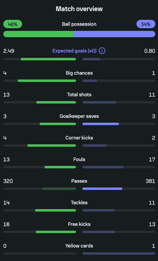 - วิลล่าครองบอล 46 เปอร์เซ็นต์ โบโลญญ่า 54 เปอร์เซ็นต์