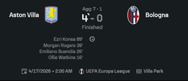 - สกอร์รวมสองนัด วิลล่าชนะ 7-1