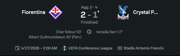 ศึกยูโรปา คอนเฟอเรนซ์ ลีก คู่นี้ ผลบอลสด 2-1 อาจดูเบา แต่รูปเกมไม่เบาเลย ฟิออเรนติน่าโดนนำก่อนจาก อิสไมลา ซาร์ ก่อนตั้งหลักกลับมาไล่บดแล้วแซงชนะคริสตัล พาเลซได้แบบเจ็บ ๆ คัน ๆ สำหรับทีมเยือน เพราะนำแล้วคุมต่อไม่ได้
