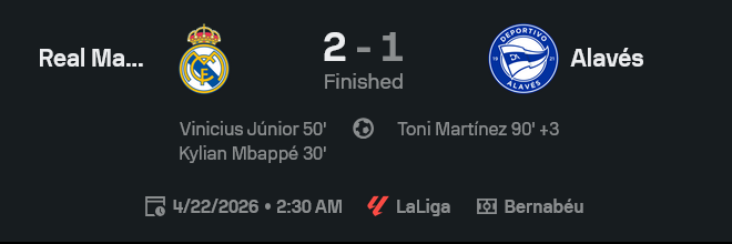 - นาที 90+3 โทนี มาร์ติเนซ ยิงให้อลาเบสไล่มา 2-1 ทำเอาเบร์นาเบวมีสะดุ้งเล็ก ๆ