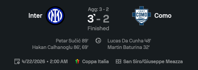 ศึก โคปปา อิตาเลีย คู่นี้บอกเลยว่าใครเดินไปชงกาแฟตอนต้นครึ่งหลัง มีสิทธิ์กลับมาแล้วงงกับ ผลบอลสด เพราะอินเตอร์เล่นเอาแฟนบอลหัวใจจะวาย หลังโดนโคโม่บุกมานำ 2 เม็ด แต่สุดท้ายฮึดกลับมายิงแซงรวดเดียว 3 ลูกรวด ปิดเกมชนะ 3-2 แบบคนดูได้ทั้งลุ้น ได้ทั้งด่า ได้ทั้งสะใจในคราวเดียว