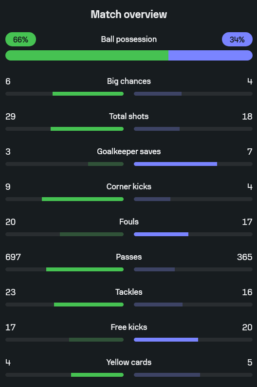 - เจ้าถิ่นยิงรวม 29 ครั้ง ส่วนทีมเยือนยิง 18 ครั้ง
