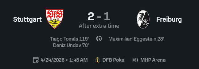 ศึกเดเอฟเบ โพคาล เยอรมัน คู่นี้เล่นกันเหมือนนัดชิงชีวิต สตุ๊ตการ์ทโดนไฟร์บวร์กนำก่อนจาก มักซิมิเลียน เอ็กเกสไตน์ นาที 28 แต่ไม่ยอมพับเสื่อกลับบ้านง่าย ๆ ก่อน เดนิซ อุนดาฟ จะซัดตีเสมอนาที 70 แล้วลากเกมไปต่อเวลาพิเศษ จน ติอาโก้ โทมัส โผล่มากดประตูชัยนาที 119 พาเจ้าถิ่นชนะ 2-1 แบบ ผลบอลสด พลิกกันจนแฟนบอลแทบลืมหายใจ