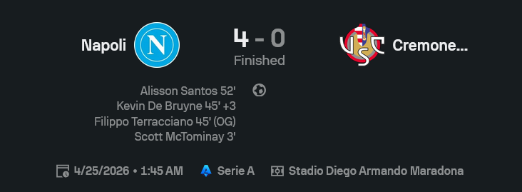 เกมนี้นาโปลีชนะเพราะออกหมัดเร็วแล้วไม่ผ่อน แดนกลางคุมจังหวะอยู่หมัด โดยเฉพาะ De Bruyne ที่เล่นเหมือนมีรีโมตสนามอยู่ในมือ ส่วน McTominay เติมเกมได้น่ากลัว แม้พลาดจุดโทษก็ยังเป็นตัวป่วนหลักของเกม