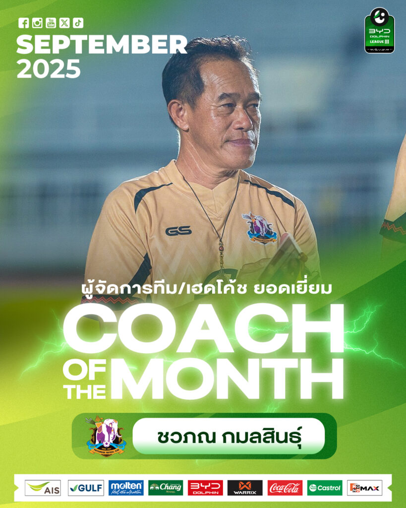 ฟอร์มร้อนแรงเกินต้านสำหรับ “โค้ชวิน” ชวภณ กมลสินธุ์ เฮดโค้ชคนเก่งของ พิษณุโลก เอฟซี ที่ได้รับการประกาศให้เป็น ผู้ฝึกสอนยอดเยี่ยม ประจำเดือนกันยายน 2568 ในศึก บีวายดี ดอลฟิน ลีกสาม ฤดูกาล 2025/26 หลังพาทัพ “ขุนพลนเรศวร” โชว์ฟอร์มสุดเฉียบชนะรวด 3 นัด เก็บเต็ม 9 คะแนน นำเป็นจ่าฝูงของโซนภาคเหนือแบบไร้ข้อกังขา