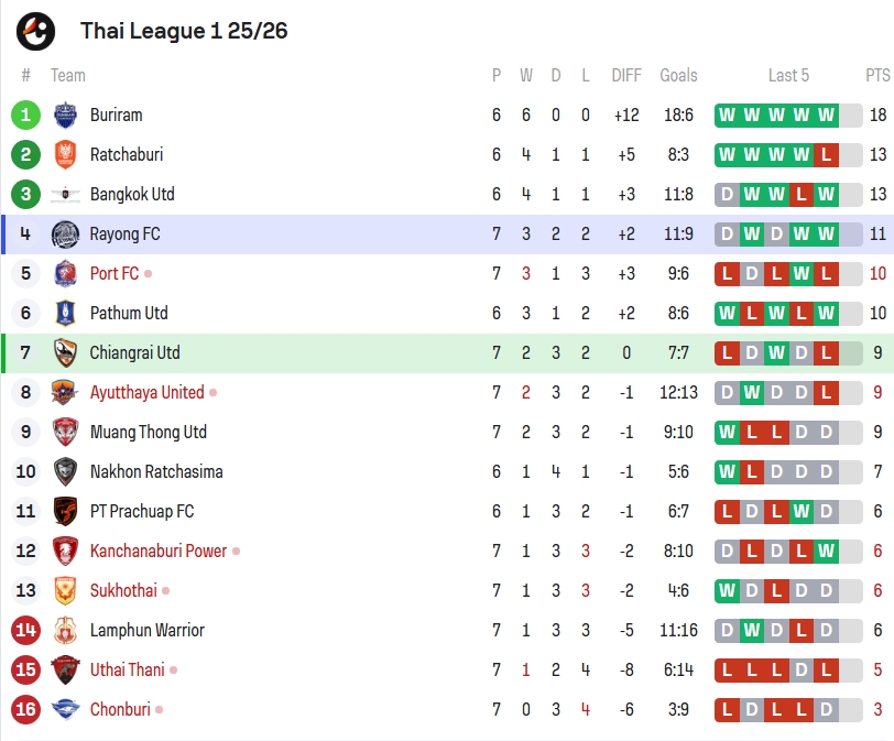 - เชียงราย ยูไนเต็ด แข่ง 7 นัด มี 9 คะแนน รั้งอันดับ 7 ฟอร์ม 5 นัดหลังสุดชนะเพียงเกมเดียว สถานการณ์เริ่มน่ากังวล หากยังขาดความเฉียบคมอาจร่วงจากโซนบนเร็ว ๆ นี้