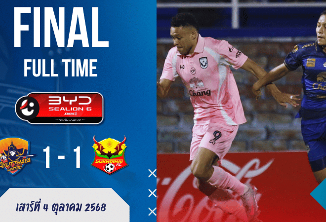 ศึก ไทยลีก BYD Sealion 6 League 1 คืนวันที่ 4 ตุลาคม 2568 ที่สนามอยุธยา สเตเดี้ยม จบลงอย่างสุดเดือดเมื่อ อยุธยา ยูไนเต็ด เปิดบ้านเสมอ สุโขทัย เอฟซี 1-1 เกมนี้เจ้าบ้านออกนำก่อนจาก เปาโล คอนราโด นาที 31 แต่ดราม่ามาในช่วงท้ายเกมเมื่อ เอลิอัส โรมิว ซัดตีเสมอให้ทีมเยือนในนาที 90+1 ช่วย “ค้างคาวไฟ” แบ่งแต้มกลับบ้านได้สำเร็จแบบหวุดหวิด