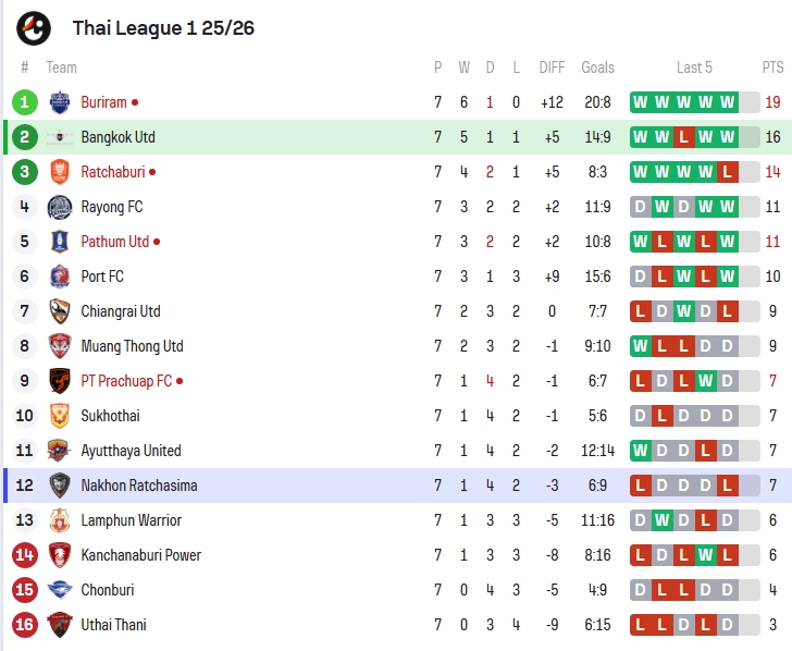 แบงค็อก ยูไนเต็ด ขยับขึ้นอันดับ 2 เก็บเพิ่มเป็น 16 คะแนน จาก 7 นัด ไล่จี้จ่าฝูง บุรีรัมย์ ยูไนเต็ด ที่มี 19 คะแนน ขณะที่ นครราชสีมา เอฟซี หล่นมาอยู่อันดับ 12 มีเพียง 7 คะแนน จาก 1 ชนะ 4 เสมอ 2 แพ้ 3