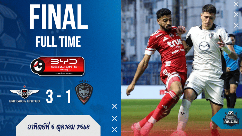 ศึกฟุตบอล ไทยลีก 1 ฤดูกาล 2025/26 นัดที่ 7 ที่สนามทรู สเตเดียม เจ้าถิ่น แบงค็อก ยูไนเต็ด ฟอร์มร้อนแรงต่อเนื่อง เปิดบ้านเอาชนะ นครราชสีมา เอฟซี ไปด้วยสกอร์ 3-1 เก็บ 3 แต้มสำคัญ ขยับขึ้นรั้งรองจ่าฝูง โดยเกมนี้ มุห์เซน อัล ฆัสซานี ยิงเบิกร่อง ก่อน “มุ้ย” ธีรศิลป์ แดงดา ปิดกล่องในช่วงท้าย ขณะที่ทีมเยือนตีไข่แตกจากจุดโทษของ ฮิโรทากะ มิตะ