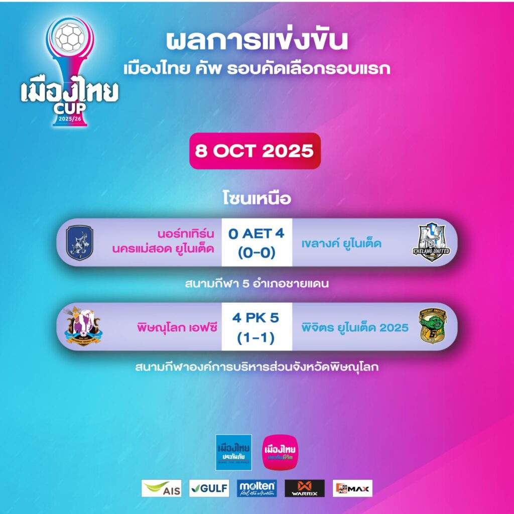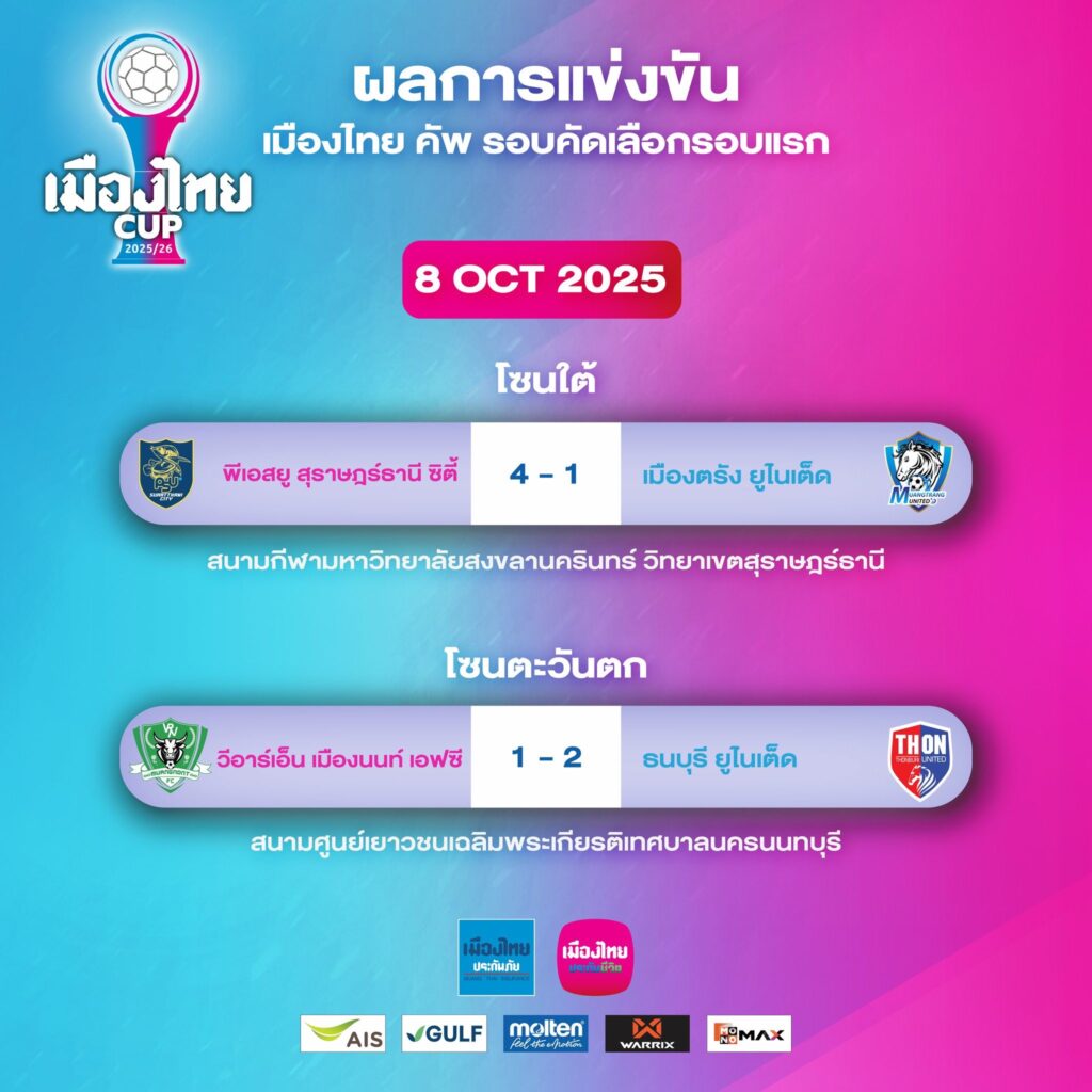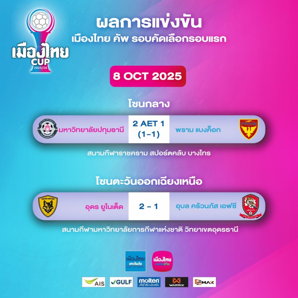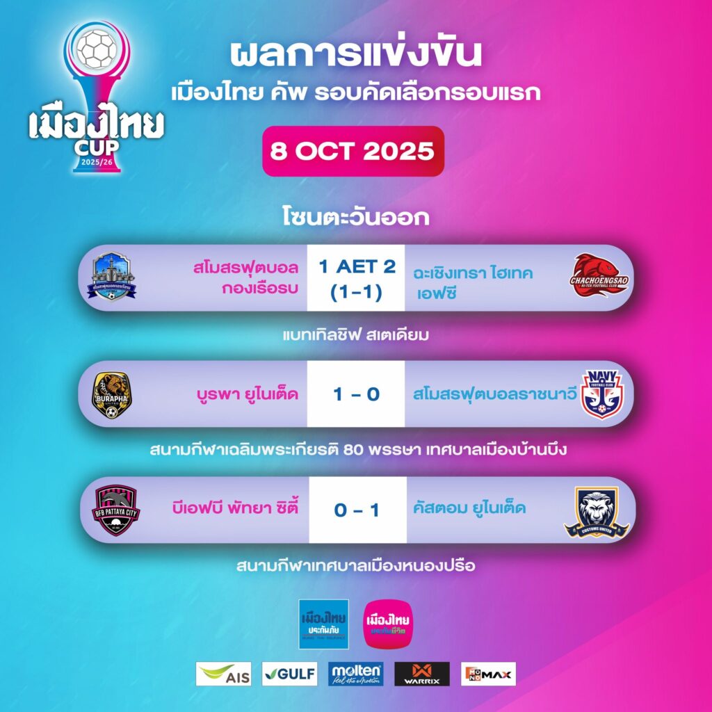 เปิดฉากอย่างเป็นทางการสำหรับศึกฟุตบอลถ้วยรายการใหญ่ของไทยอย่าง “เมืองไทย คัพ” ฤดูกาล 2025/26 ซึ่งเมื่อวันที่ 8 ตุลาคม 2568 ที่ผ่านมา ได้มีการฟาดแข้งรอบคัดเลือกรอบแรกกันไปแล้วอย่างเข้มข้น โดยเป็นการลงสนามของสโมสรจาก ไทยลีก 3 ในทุกโซนทั่วประเทศ ซึ่งผลการแข่งขันเต็มไปด้วยความดราม่า ทั้งต่อเวลาพิเศษและดวลจุดโทษลุ้นกันจนนาทีสุดท้าย