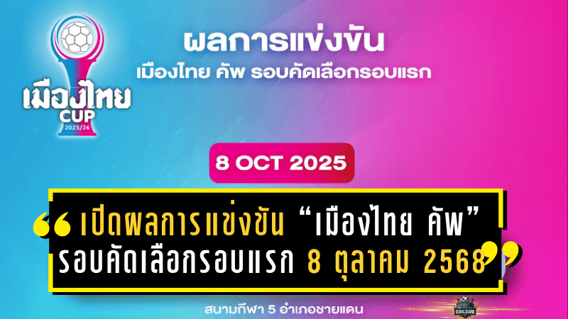 เปิดฉากอย่างเป็นทางการสำหรับศึกฟุตบอลถ้วยรายการใหญ่ของไทยอย่าง “เมืองไทย คัพ” ฤดูกาล 2025/26 ซึ่งเมื่อวันที่ 8 ตุลาคม 2568 ที่ผ่านมา ได้มีการฟาดแข้งรอบคัดเลือกรอบแรกกันไปแล้วอย่างเข้มข้น โดยเป็นการลงสนามของสโมสรจาก ไทยลีก 3 ในทุกโซนทั่วประเทศ ซึ่งผลการแข่งขันเต็มไปด้วยความดราม่า ทั้งต่อเวลาพิเศษและดวลจุดโทษลุ้นกันจนนาทีสุดท้าย