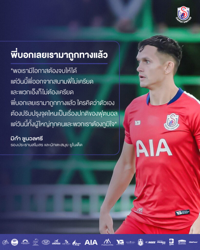 มิก้า ชูนวลศรี กองหลังจอมเก๋าและรองประธานสโมสรของ สมุย ยูไนเต็ด ออกมายืนยันชัดหลังจบเกมบุกพ่าย นรา ยูไนเต็ด ว่าเขายังคงมีความสุขอย่างเต็มเปี่ยมที่ได้ลงเล่นฟุตบอลให้กับทีมบ้านเกิด แม้ผลงานช่วงหลังจะไม่เป็นไปตามเป้าก็ตาม