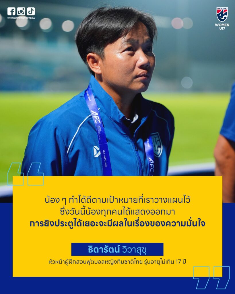“โค้ชมิ่ม” ธิดารัตน์ วิวาสุขุ หัวหน้าผู้ฝึกสอน ฟุตบอลหญิงทีมชาติไทย รุ่นอายุไม่เกิน 17 ปี กล่าวเปิดใจหลังพาทีมโชว์ฟอร์มสุดโหด ไล่ถล่ม เติร์กเมนิสถาน ไปถึง 17-0 ในศึก ฟุตบอลหญิง U17 ชิงแชมป์เอเชีย 2026 รอบคัดเลือก กลุ่ม เอฟ นัดเปิดสนาม ที่จังหวัดชลบุรี