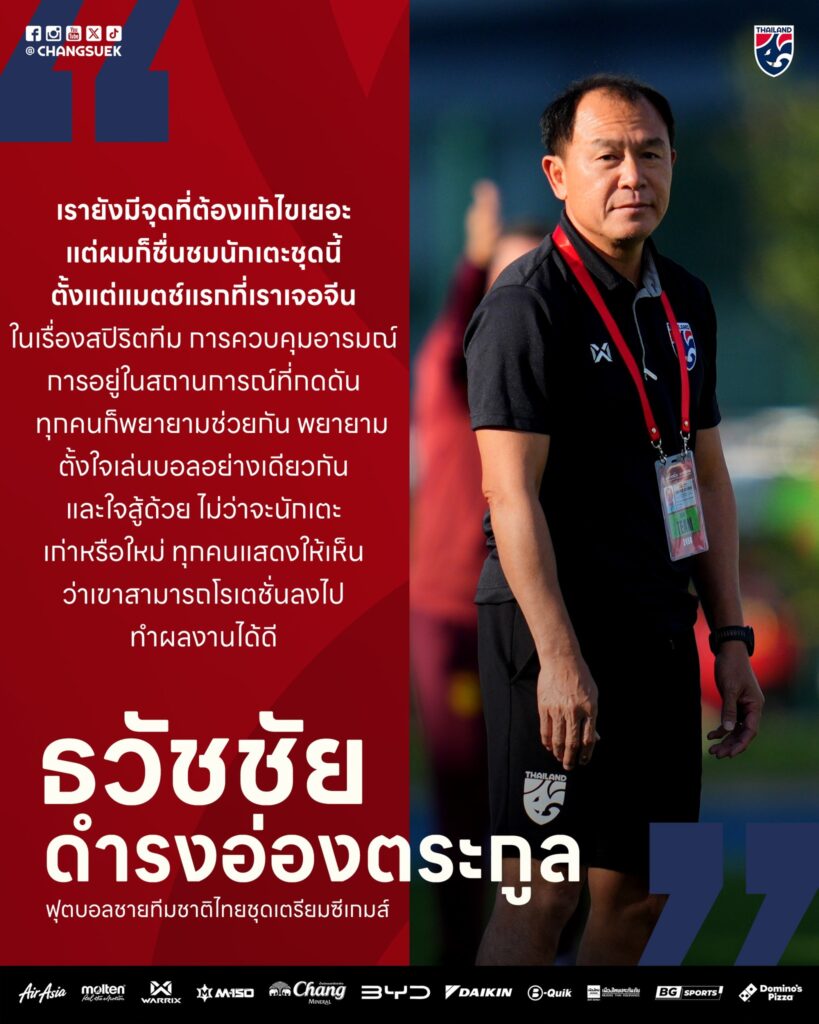 “เรายังมีจุดที่ต้องแก้ไขเยอะ แต่ผมก็ชื่นชมนักเตะชุดนี้ ตั้งแต่แมตช์แรกที่เราเจอจีน ในเรื่องสปิริตทีม การควบคุมอารมณ์ การอยู่ในสถานการณ์ที่กดดัน ทุกคนก็พยายามช่วยกัน พยายามตั้งใจเล่นบอลอย่างเดียวกัน และใจสู้ด้วย ไม่ว่าจะนักเตะเก่าหรือใหม่ ทุกคนแสดงให้เห็นว่าเขาสามารถโรเตชั่นลงไปทำผลงานได้ดี”