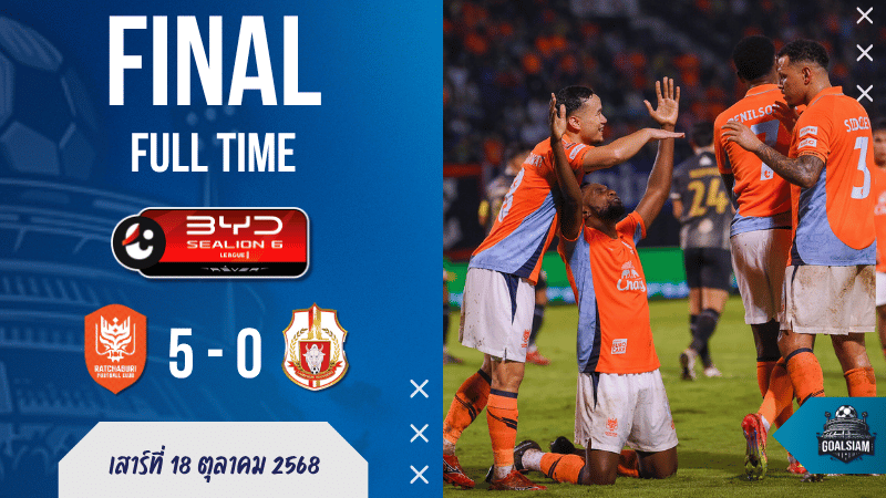 ค่ำคืนที่ มิตรผล สเตเดียม แฟนบอล “ราชันมังกร” ได้ส่งเสียงเฮลั่นสนาม หลัง ราชบุรี เอฟซี โชว์ฟอร์มสุดโหด ไล่ถล่ม ลำพูน วอริเออร์ ไปแบบขาดลอย 5-0 ในศึก ไทยลีก ฤดูกาล 2025/26 เมื่อวันที่ 18 ตุลาคมที่ผ่านมา เกมนี้เป็นการตอกย้ำว่า ราชบุรีกลับมาอยู่ในฟอร์มแกร่งอย่างแท้จริง โดยมี เดนี่ จูเนียร์ เป็นพระเอกยิง 2 ประตู พาทีมขึ้นรั้งอันดับ 3 ของตารางคะแนนอย่างสง่างาม