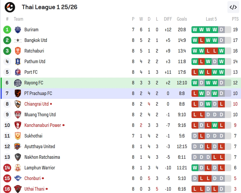 ส่วน พีที ประจวบ เอฟซี เก็บเพิ่มเป็น 10 คะแนน อยู่อันดับ 7 ของตาราง ฟอร์มยังแกว่งเล็กน้อยแต่ไม่แพ้มา 4 นัดหลังสุด (D D W D)