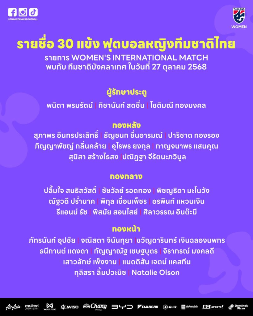 สมาคมกีฬาฟุตบอลแห่งประเทศไทยฯ ภายใต้พระบรมราชูปถัมภ์ ได้ประกาศรายชื่อ 30 นักฟุตบอลหญิงทีมชาติไทย ชุดเตรียมลงสนามในศึก ฟุตบอลอุ่นเครื่องตามปฏิทินฟีฟ่าเดย์ (FIFA Day) เดือนตุลาคม รายการ Women’s International Match พบกับ ทีมชาติบังคลาเทศ ซึ่งจะแข่งขันในวันที่ 27 ตุลาคม 2568 ภายใต้การนำทัพของ “โค้ชหนึ่ง” หนึ่งฤทัย สระทองเวียน หัวหน้าผู้ฝึกสอนหญิงทีมชาติไทย