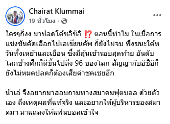 “ใครๆก็งง มาปลด โค้ชอิชิอิ!? ตอนนี้ทำไม ในเมื่อการแข่งขันคัดเลือกไปเอเชียนคัพ ก็ยังไม่จบ พึ่งชนะใต้หวันทั้งเหย้าและเยือน ซึ่งมีลุ้นเข้ารอบสุดท้าย อันดับโลกช้างศึกก็ดีขึ้นไปถึง 96 ของโลก สัญญากับอิชิอิก็ยังไม่หมดปลดก็ต้องเสียค่าชดเชยอีก”