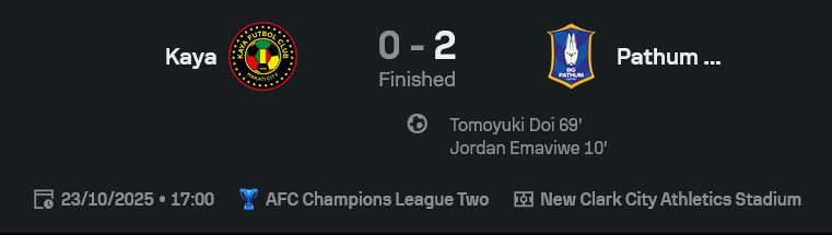เกมนี้ถือว่าเป็นแมตช์ที่ บีจี ปทุม ยูไนเต็ด เล่นกันได้คมกริบตั้งแต่ต้นยันจบ เกมรุกมาไวและเฉียบขาด ส่งผลให้ “เดอะ แรบบิท” บุกเชือด คายา เอฟซี ถึงถิ่น 0-2 เก็บ 3 แต้มแรกในกลุ่ม H ได้สำเร็จจากการแข่งขัน เอเอฟซี แชมเปี้ยนส์ลีก อีลิท ทู นัดที่ 3 ของรอบแบ่งกลุ่ม เริ่มเกมแค่ 10 นาที จอร์แดน เอ็มมาวีวา ยิงให้ทีมขึ้นนำ ก่อนที่ครึ่งหลัง Tomoyuki Doi จะซัดปิดกล่องในนาที 69 พาทีมคว้าชัยได้อย่างสวยงาม เรียกความมั่นใจกลับมาสู่วงใน หลังสองเกมแรกไร้แต้ม ผลบอลสด จบเกม คายา เอฟซี 0-2 บีจี ปทุม ยูไนเต็ด