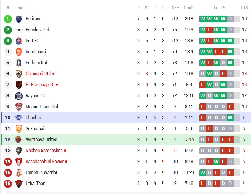 Chonburi FC ขยับขึ้นมาอันดับ 10 ของตาราง มี 8 คะแนนจาก 9 นัด กลับมาเก็บชัยชนะได้ในจังหวะสำคัญ ส่วน Ayutthaya United ยังคงนิ่งอยู่ที่อันดับ 12 มี 7 คะแนนจาก 9 นัด รูปเกมโดยรวมถือว่าดีขึ้นแต่ความผิดพลาดเล็กน้อยยังเป็นจุดชี้เป็นชี้ตาย