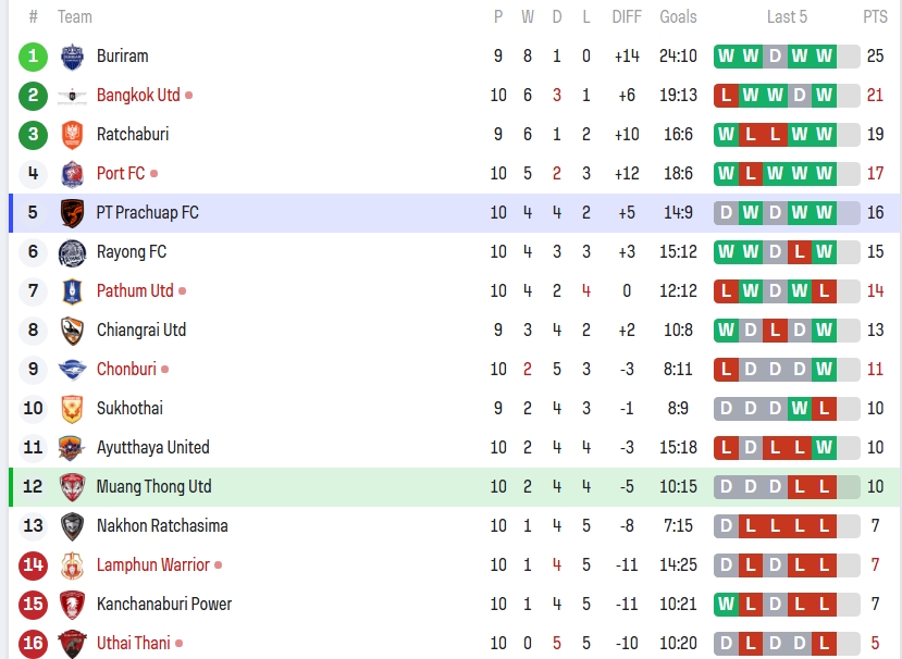 ส่วน เมืองทอง ยูไนเต็ด อยู่ที่อันดับ 12 มีเพียง 10 คะแนนจาก 10 นัด และเสียไปถึง 15 ประตู ถือเป็นช่วงเวลาหนักของทีมดังจากนนทบุรี