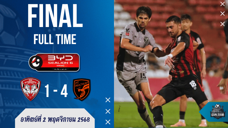 ศึก ไทยพรีเมียร์ลีก สุดร้อนแรงที่ สเตเดี้ยม ธันเดอร์โดม จบลงด้วยเสียงช็อกของแฟนเจ้าถิ่น เมื่อ เมืองทอง ยูไนเต็ด พ่ายคาบ้านต่อ พีที ประจวบ เอฟซี ไปแบบหมดรูป 1-4 เกมนี้เต็มไปด้วยอารมณ์ ดราม่า และความผิดพลาด โดยเฉพาะใบแดงของ “กษิดิ์เดช เวทยาวงศ์” ที่ทำให้กิเลนผยองพังไม่เป็นท่า ส่วน “อิกลาส ซันรอน” ซัดแหลกเหมาคนเดียวสองลูก คว้า Man of the Match ไปครองอย่างเหนือชั้น