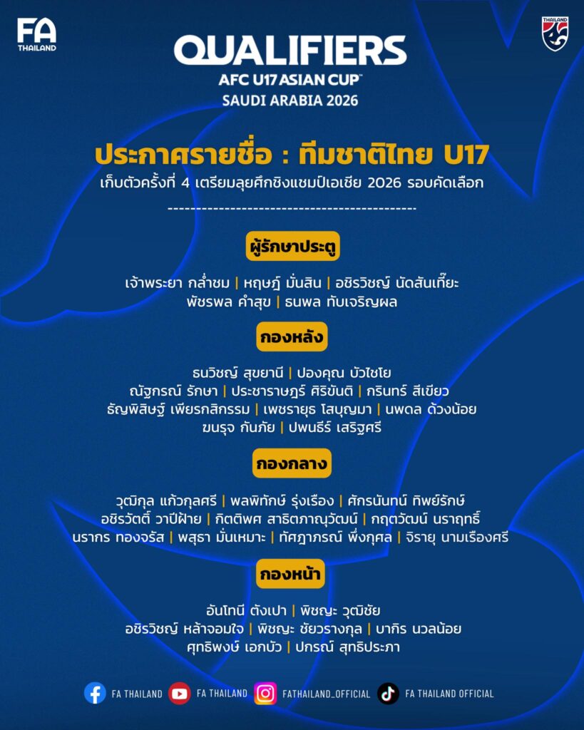 สมาคมกีฬาฟุตบอลแห่งประเทศไทยฯ ภายใต้การดูแลของ มาร์โค ก็อคเคิ่ล หัวหน้าผู้ฝึกสอนทีมชาติไทยรุ่นอายุไม่เกิน 17 ปี ประกาศรายชื่อ 32 นักเตะ “ช้างศึก U17 เพื่อเข้าเก็บตัวฝึกซ้อมเตรียมความพร้อมก่อนลุยศึก AFC U17 Asian Cup Saudi Arabia 2026 รอบคัดเลือก ที่จะจัดขึ้นระหว่างวันที่ 22–30 พฤศจิกายน 2568 ณ จังหวัดชลบุรี