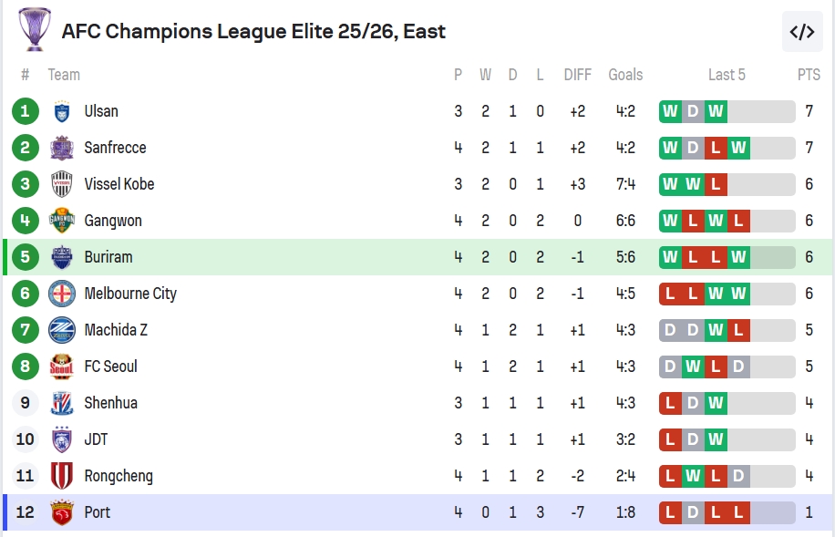 ส่วน เซี่ยงไฮ้ พอร์ต ยังจมบ๊วยของตาราง มีเพียง 1 คะแนนจาก 4 เกม และเสียไปถึง 8 ประตู ฟอร์มเรียกว่า “หลุดกรอบ”