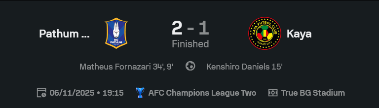 แฟนบอลกระตุกยิ้มหลัง บีจี ปทุม ยูไนเต็ด กลับมาโชว์ฟอร์มดุในบ้าน ไล่บดเอาชนะ คายา เอฟซี 2-1 ศึก เอเอฟซี แชมเปี้ยนส์ลีก อีลิท ทู 2025/26 เกมนี้เหมือนจะง่ายแต่ดันมีดราม่าให้เหงื่อตก เพราะหลังนำไวกลับโดนตีเสมอ ก่อนที่ “มาธิอัส ฟอร์นาซารี” จะสวมบทฮีโร่ซัดเบิ้ลพาทีมคว้าชัยในที่สุด เรียกเสียงเฮสะใจจากแฟน “เดอะ แรบบิท” ที่ลีโอ สเตเดียม พร้อมขยับแต้มสำคัญในกลุ่ม H