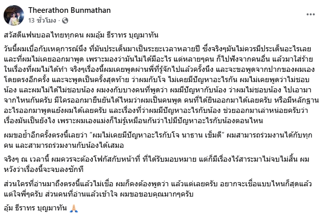 หลังจากถูกโยงข่าวมานานหลายปีว่าไม่ลงรอยกับ “โจนาธาร เข็มดี” แข้งลูกครึ่งไทย–เดนมาร์ก รุ่นน้องในทีมชาติไทย ล่าสุด “อุ้ม ธีราทร บุญมาทัน” แบ็กซ้ายกัปตันทีมชาติไทย ได้ออกมาโพสต์ข้อความผ่านโซเชียลมีเดียส่วนตัวเพื่อเคลียร์ทุกข้อสงสัย ยืนยันอย่างชัดเจนว่า ไม่มีปัญหาส่วนตัวกับใครทั้งสิ้น และขอให้ดราม่านี้สิ้นสุดลงเสียที