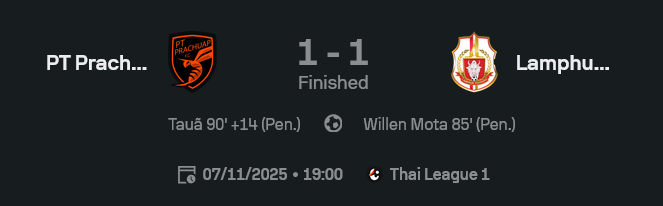 เกมเดือดแห่งศึก ไทยลีก 2025/26 ที่สนามสามอ่าว สเตเดียม ต้องเรียกว่าเป็นหนึ่งในแมตช์ที่แฟนบอลลุ้นกันจนแทบหัวใจวาย เมื่อ พีที ประจวบ เอฟซี เปิดบ้านเสมอ ลำพูน วอร์ริเออร์ แบบสุดมัน 1-1 ทั้งสองประตูมาจากจุดโทษช่วงท้ายเกม! งานนี้แฟนบอลได้ลุ้นยันนาที 90+14 ก่อนที่ “ตูอา” จะรับบทฮีโร่ซัดตีเสมอให้ “ต่อพิฆาต” คว้าแต้มสำคัญไว้ได้ในบ้าน ส่วนฝั่ง “วิลเลน โมตา” ของลำพูนก็ไม่ธรรมดา ยิงนำก่อนในนาที 85 จากจุดโทษเช่นกัน เรียกว่าเกมนี้ VAR ทำงานจนเสียงลั่นทั้งสนาม ส่วน ผลบอลสด ออกมาคือ 1-1 แต่ฟีลเกมเหมือนเล่นกันสามชั่วโมงเต็ม