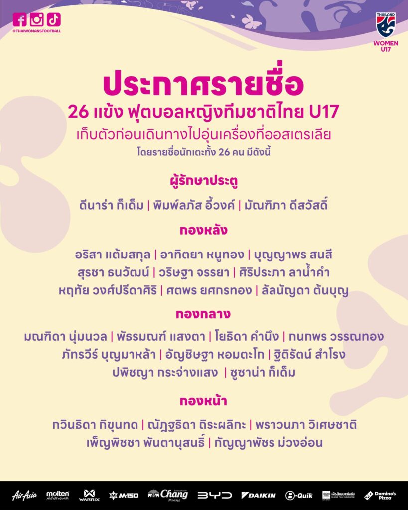 สมาคมกีฬาฟุตบอลแห่งประเทศไทย ในพระบรมราชูปถัมภ์ ประกาศรายชื่อ 26 นักฟุตบอลหญิงทีมชาติไทย รุ่นอายุไม่เกิน 17 ปี ภายใต้การคุมทีมของ “โค้ชมิ่ม” ธิดารัตน์ วิวาสุขุ เพื่อเตรียมเก็บตัวก่อนเดินทางไปอุ่นเครื่อง 2 นัดกับ ทีมชาติออสเตรเลียหญิง U17 ระหว่างวันที่ 22–28 พฤศจิกายน 2568 ที่นครซิดนีย์ ประเทศออสเตรเลีย