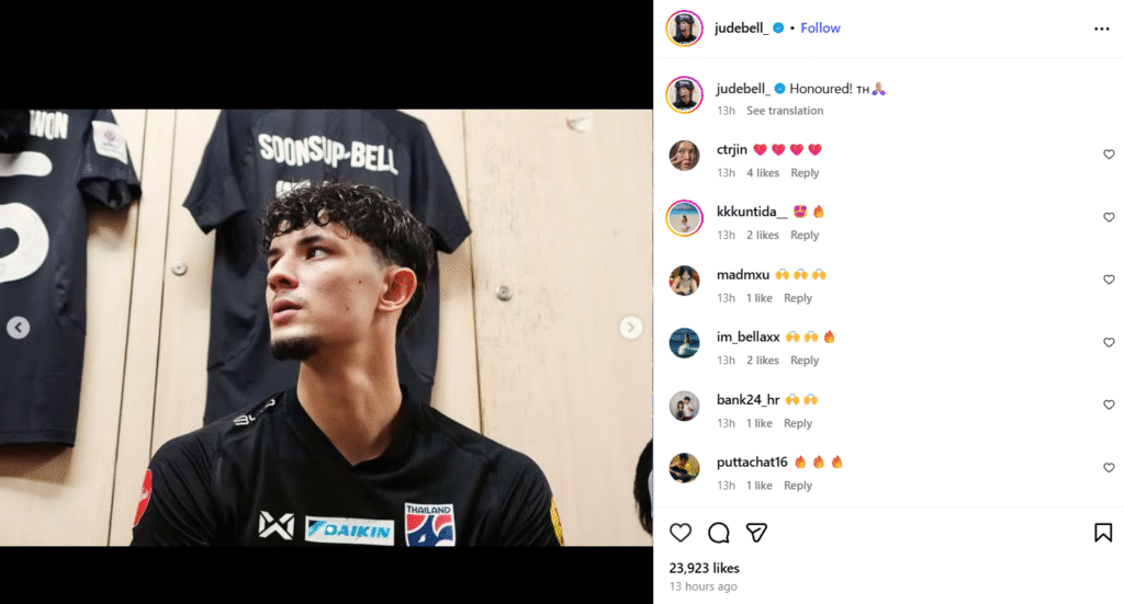 ประโยคนี้เพียงคำเดียว ยืนยันทุกอย่าง—ทั้งความมุ่งมั่น ความภาคภูมิใจ และความผูกพันกับประเทศไทยที่แฟนบอลเฝ้าคาดหวัง เหล่าแฟนบอลต่างเข้ามาคอมเมนต์ให้กำลังใจและต้อนรับเขาสู่เส้นทางทีมชาติอย่างล้นหลาม