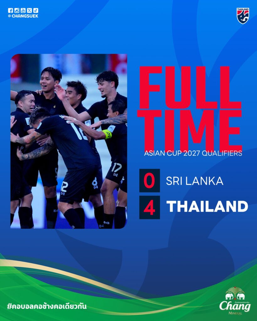 ทีมชาติไทย ยังคงโชว์ฟอร์มได้ดุดันประดุจพายุบุแคม บุกไปสอนเชิงลูกหนังถึงถิ่น ศรีลังกา ด้วยสกอร์ขาดลอย 4-0 ในศึกฟุตบอล เอเชียน คัพ 2027 รอบคัดเลือก รอบ 3 เมื่อค่ำคืนวันที่ 18 พฤศจิกายน 2568 ที่ผ่านมา เป็นการประกาศศักดาว่าตั๋วเครื่องบินสู่ ซาอุดีอาระเบีย นั้นอยู่ใกล้แค่เอื้อม!
