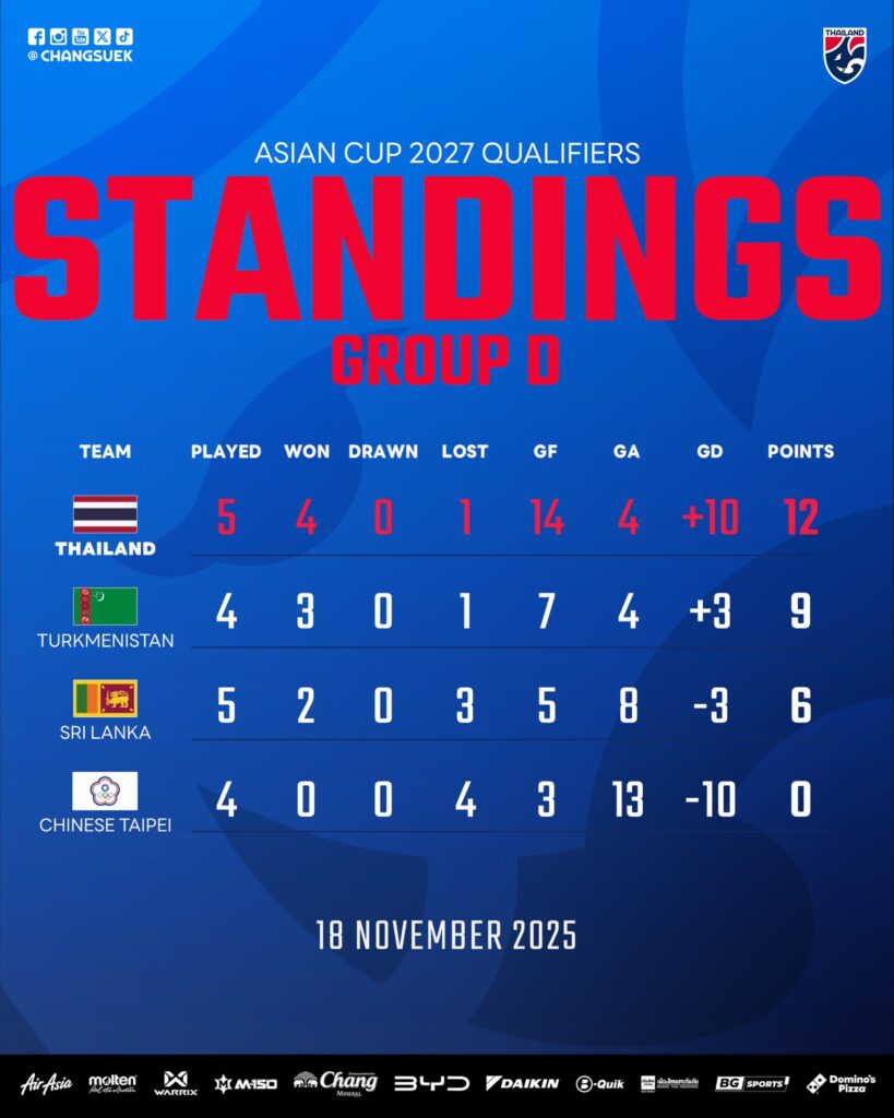 หลังผ่านการแข่งขัน 5 นัด ทีมชาติไทยเก็บชัยชนะไปถึง 4 นัด ยิงไป 14 ประตู และเสียเพียง 4 ลูก รวมผลต่างประตูได้เสีย +10 และมี 12 คะแนน นั่งแท่นจ่าฝูงของกลุ่มแบบไม่ต้องลุ้นหน้าใหม่